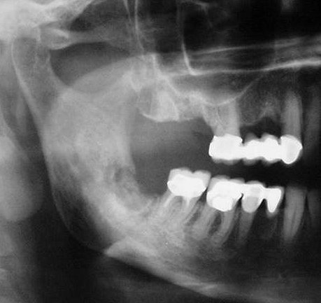 - Η ακτινογραφική εικόνα συνήθως είναι διάχυτη διαυγαστική αλλοίωση με ανώμαλα, ασαφή ή σκοροφαγωμένα όρια. Ορισμένες φορές εντός της διαύγασης είναι δυνατόν να βρεθούν ακανόνιστες σκιάσεις που οφείλονται σε οστικά απολύματα.