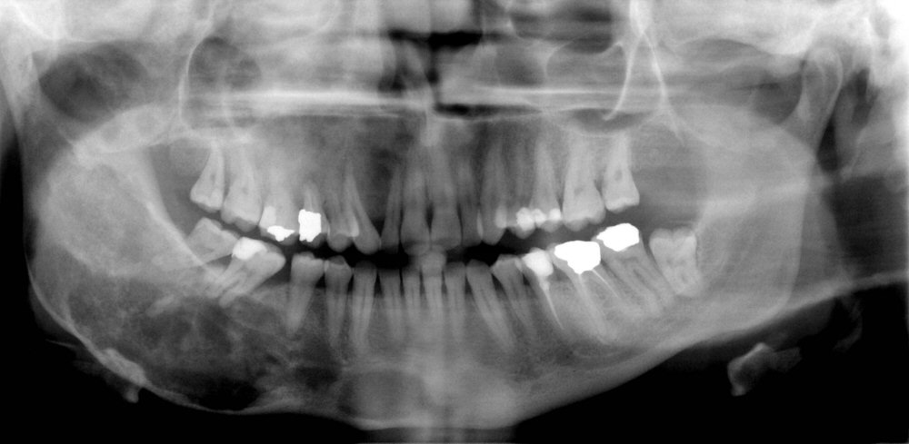 - Αρχικά η βλάβη απεικονίζεται σαν διάχυτη διαύγαση με ασαφή όρια. Με την πάροδο του χρόνου γίνεται εναπόθεση λεπτών παθολογικών οστικών δοκίδων που δίνουν την μικτή οστεολυτική/οστεοπλαστική εικόνα. Καθώς η βλάβη εξελίσσεται, η συσώρευση των παθολογικών οστικών δοκίδων δημιουργεί την χαρακτηριστική εικόνα της “φλούδας πορτοκαλιού” ή του “αμμοβολημένου γυαλιού, ground glass”.