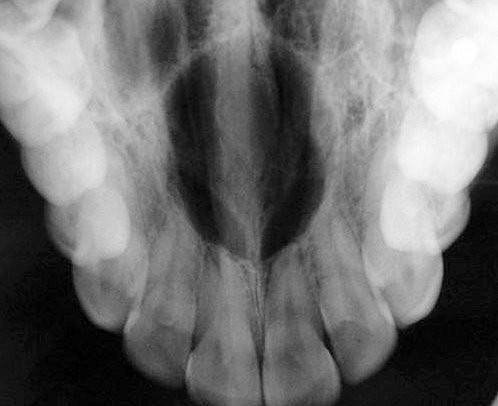 - Η εντόπιση της είναι χαρακτηριστική μεταξύ των ριζών των κεντρικών τομέων της άνω γνάθου. Μπορεί να προκαλέσει μετατόπιση των παρακειμένων δοντιών και πολύ σπάνια απορρόφηση της ρίζας. Επίσης μπορεί να προκαλέσει διόγκωση στη μέση γραμμή της υπερώας,