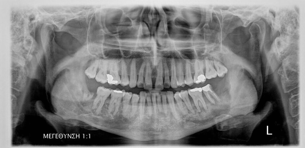 - Ακτινογραφικά ευρήματα: Παρατηρείται διάχυτη οστεολυτική βλάβη με ασαφή και σκοροφαγωμένα όρια, η οποία προκαλεί λύση και διάτρηση των συμπαγών πετάλων της γνάθου, καταλαμβάνοντας μεγάλο μέρος του σπογγώδους οστού. Συχνά οι βλάβες απεικονίζονται ως μικτές με την παρουσία οστικών απολυμάτων εντός των οστεολυτικών βλαβών. Σε προχωρημένα στάδια η βλάβη μπορεί να προκαλέσει παθολογικό κάταγμα της γνάθου.