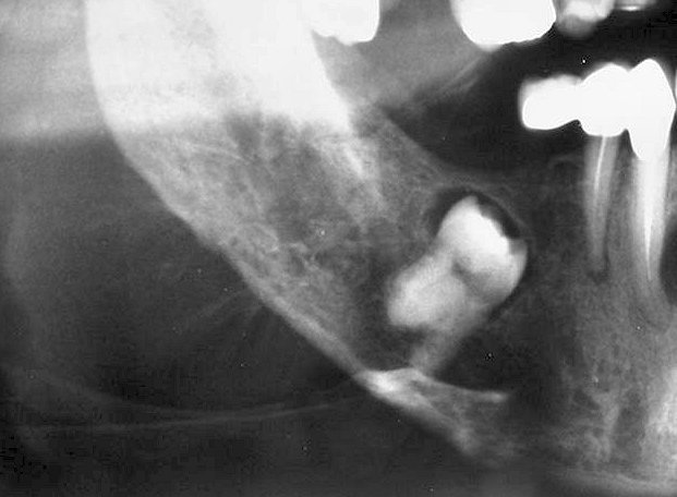 - Osteolytic – no neoplastic bone formation: radiolucency with poorly defined or moth-eaten borders, loosening of the adjacent teeth.